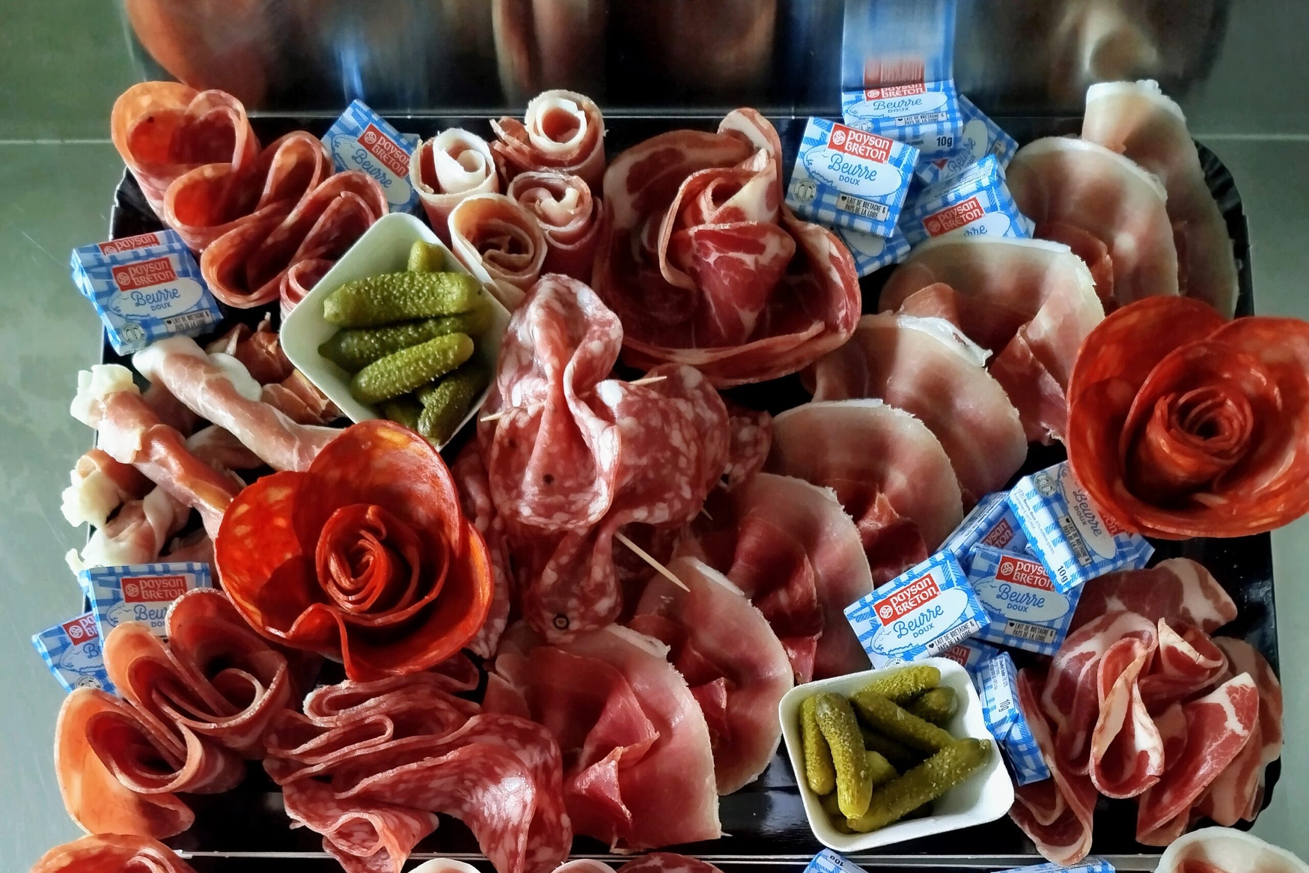 Composé d’une sélection variée charcuteries (jambon de pays, coppa, rosette,…) accompagné de terrine, cornichons et beurre, le tout joliment dressé pour un effet aussi beau que bon.